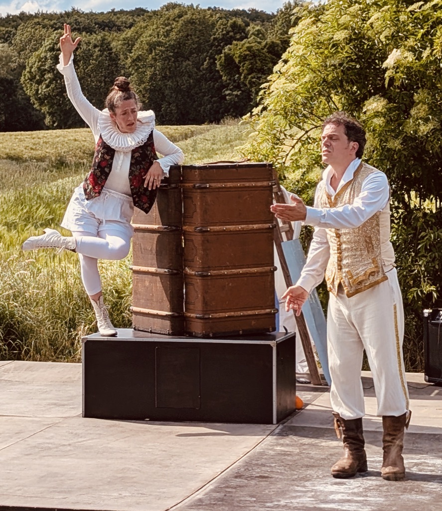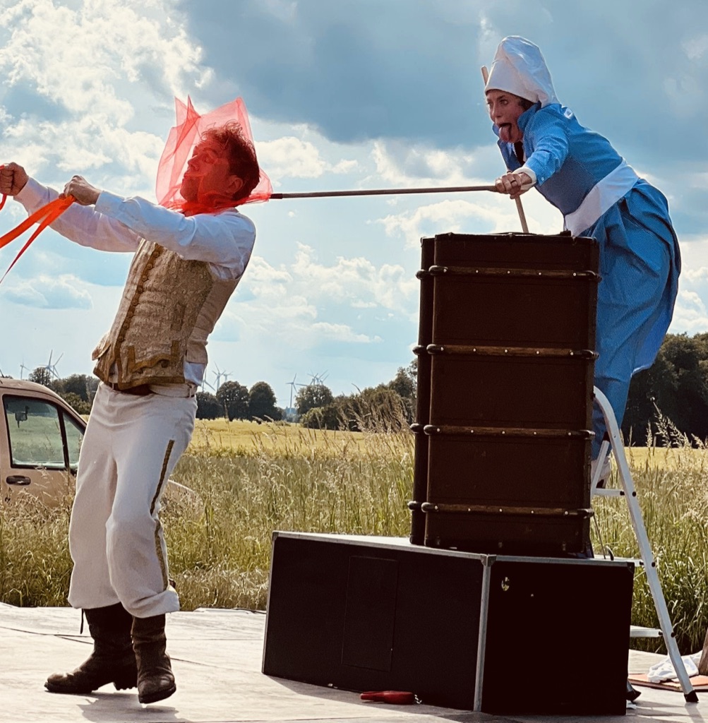 Der Prinz ist sterbenskrank und nur das Lachen kann ihn heilen. Als lustige Gags und Zaubersprüche keine Wirkung zeigen, wird er mit einem Fluch belegt: Er muss die drei Orangen suchen, die sich im Land der Riesen befinden. Sein clownesker Diener Truffaldino begleitet ihn auf seiner abenteuerlichen Reise, doch scheinbar kann den Prinzen nichts aus seiner tödlichen Lethargie befreien. Aber der treue Truffaldino hat noch ein letztes Ass im Ärmel… Ein witziges, parodistisches und rasantes Märchen von der Suche nach dem Lachen, mit viel Humor, Ironie und Musik inszeniert.